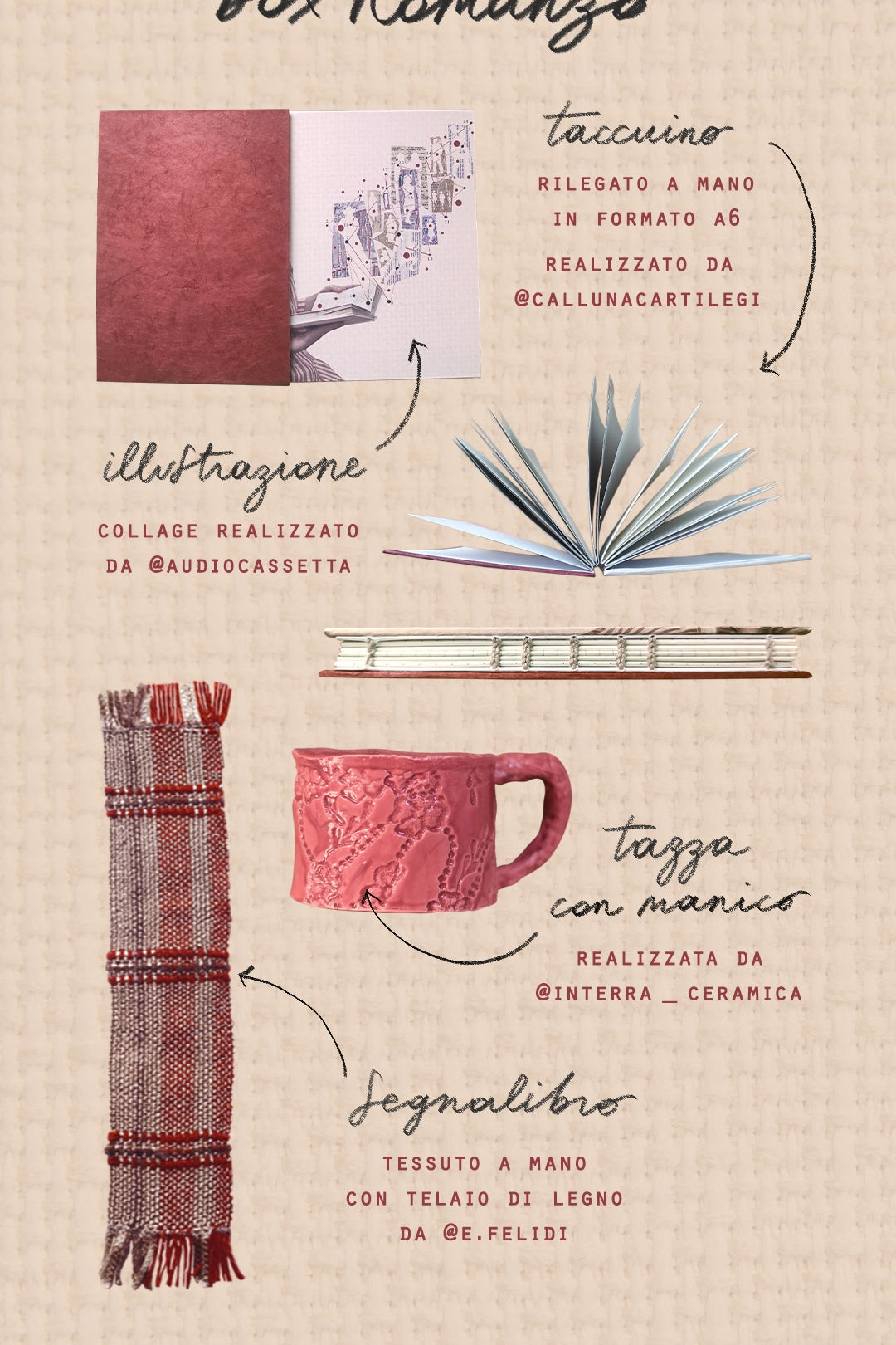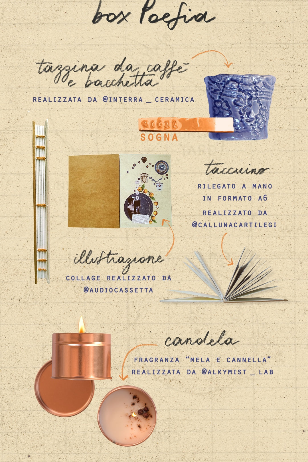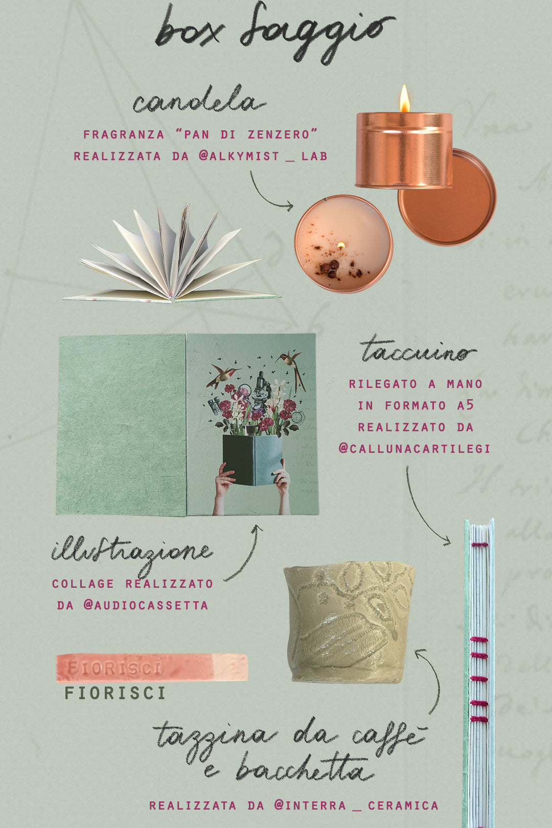 Tre box – ognuno comprendente una mia illustrazione, una tazza o tazzina, un taccuino e una candela – realizzati in collaborazione con InTerra Ceramica, Calluna Cartilegi, Alkymist Lab.