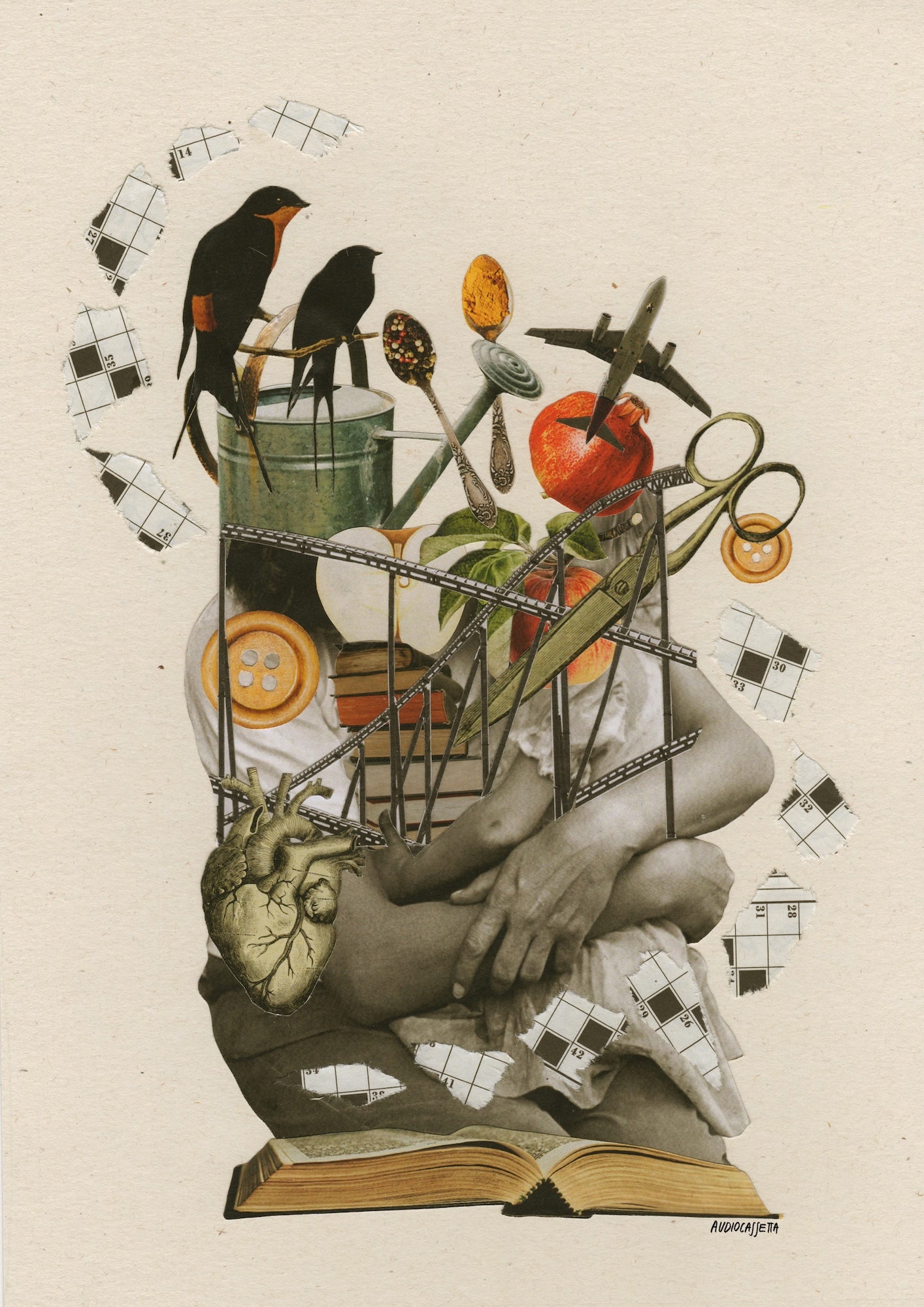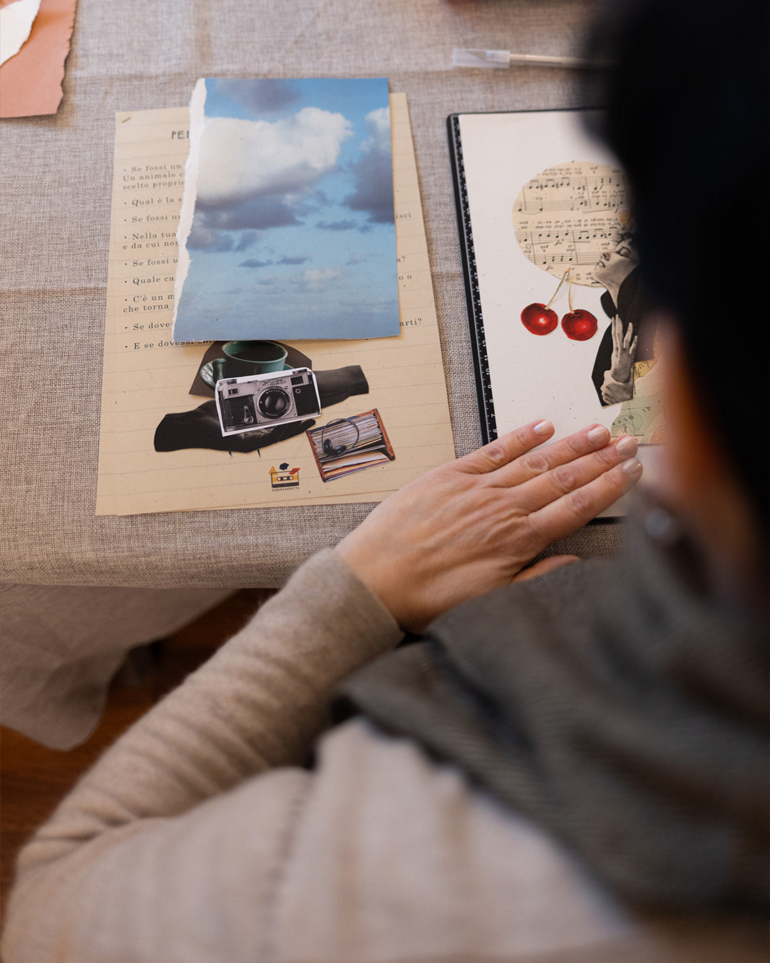 Con rispetto e gratitudine, ascolto ogni storia che mi viene affidata. In questo modo riesco ad entrare in empatia e a selezionare gli elementi da ritagliare per poi assemblarli con cura, creando così collage dal forte impatto visivo ma anche capaci di comunicare.