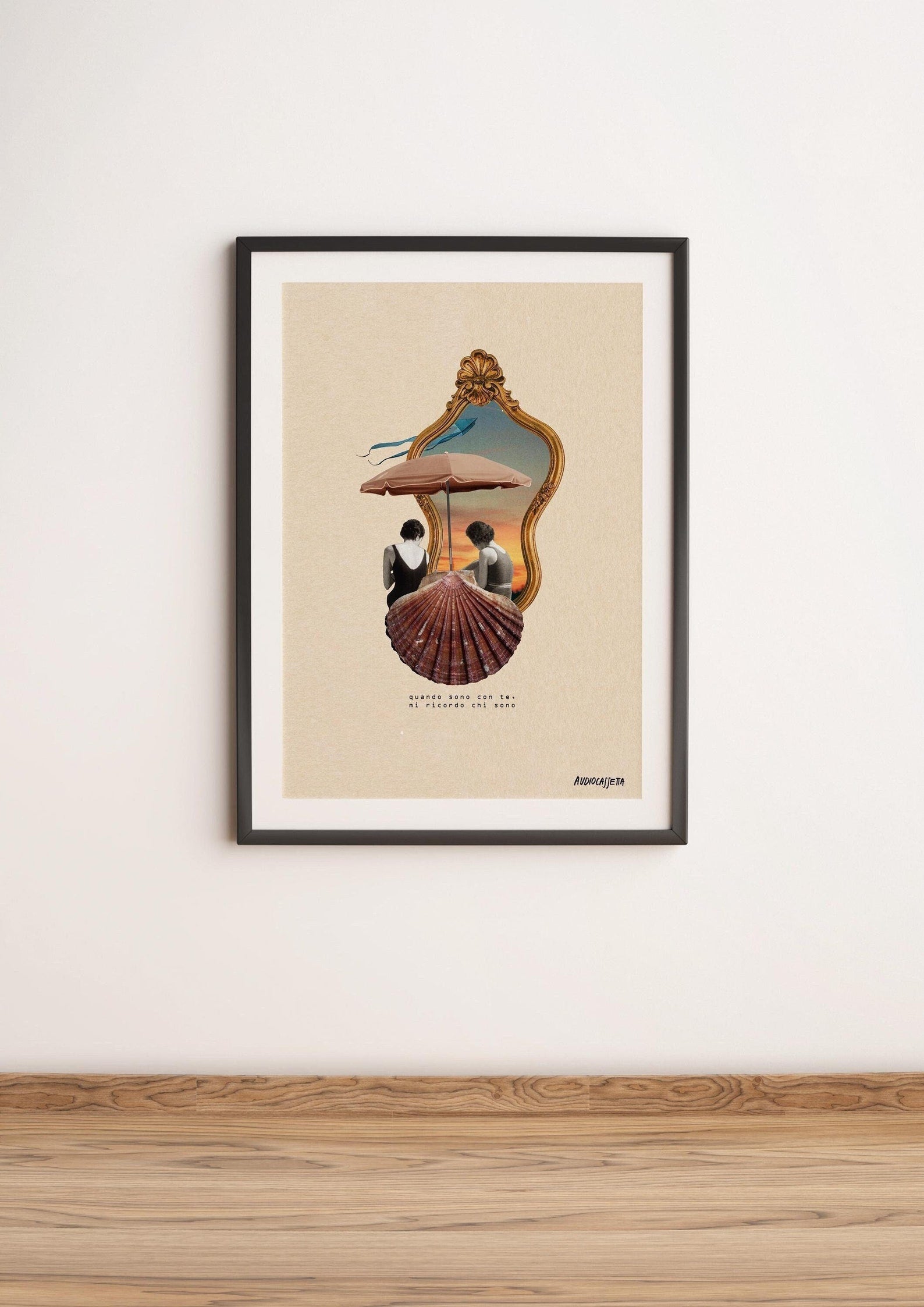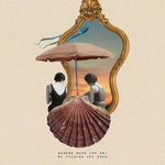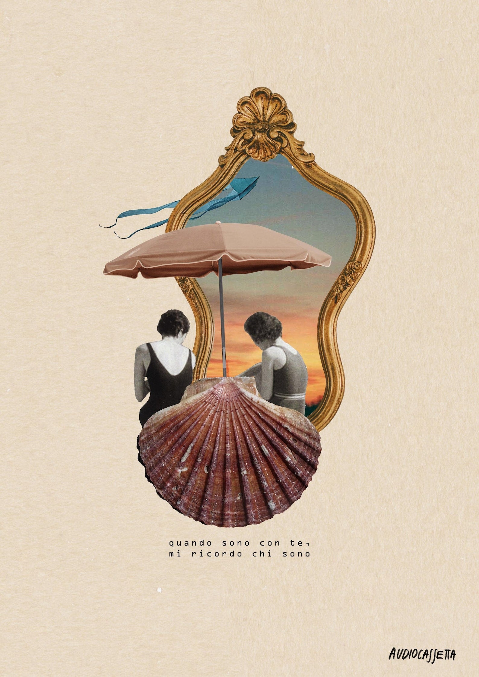 Al centro del collage una conchiglia, su cui sono sedute due donne di spalle.