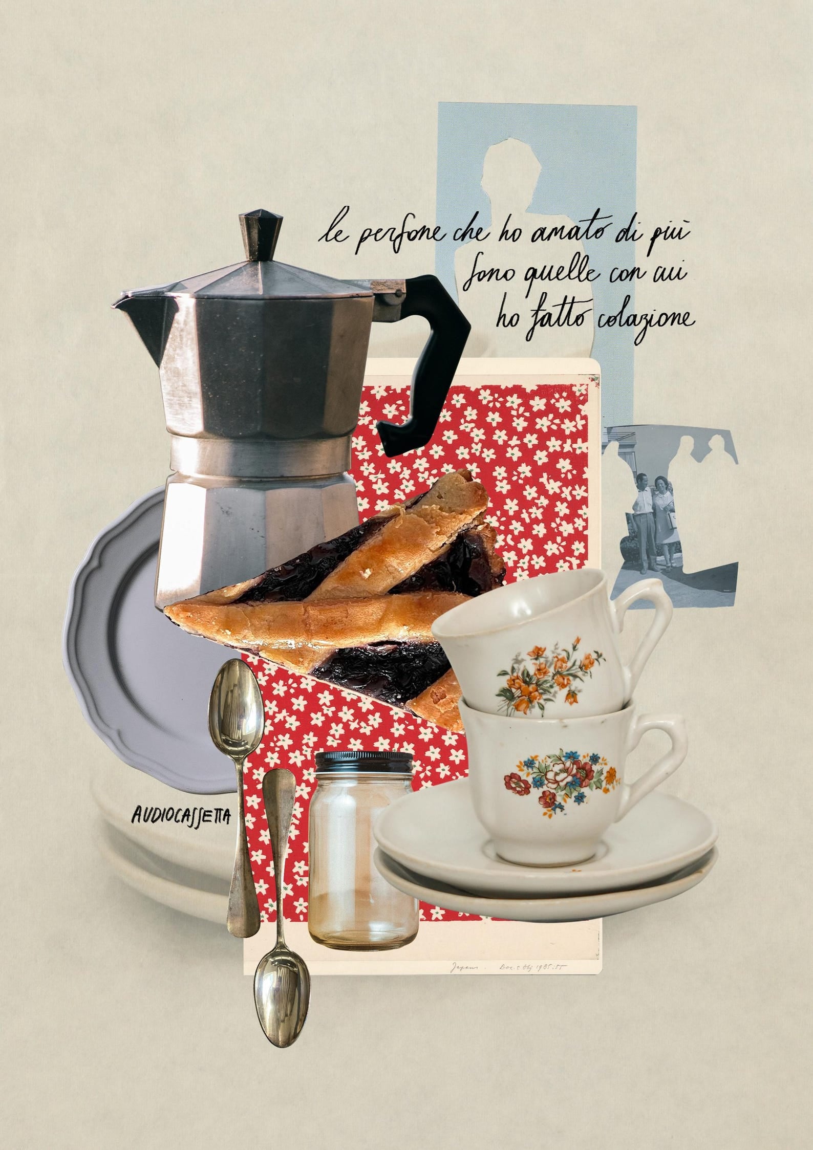 Questo collage nasce da un pensiero sorto durante un viaggio in macchina. Mi chiedevo perché la colazione sia il mio momento preferito della giornata, il mio imperativo categorico. Forse perché è il tempo delle possibilità, quando tutto deve ancora accadere e sono ancora senza difese. Pensandoci, mi sono accorta che le persone con cui ho condiviso questo momento sono spesso le persone che amo, e ho amato, di più.