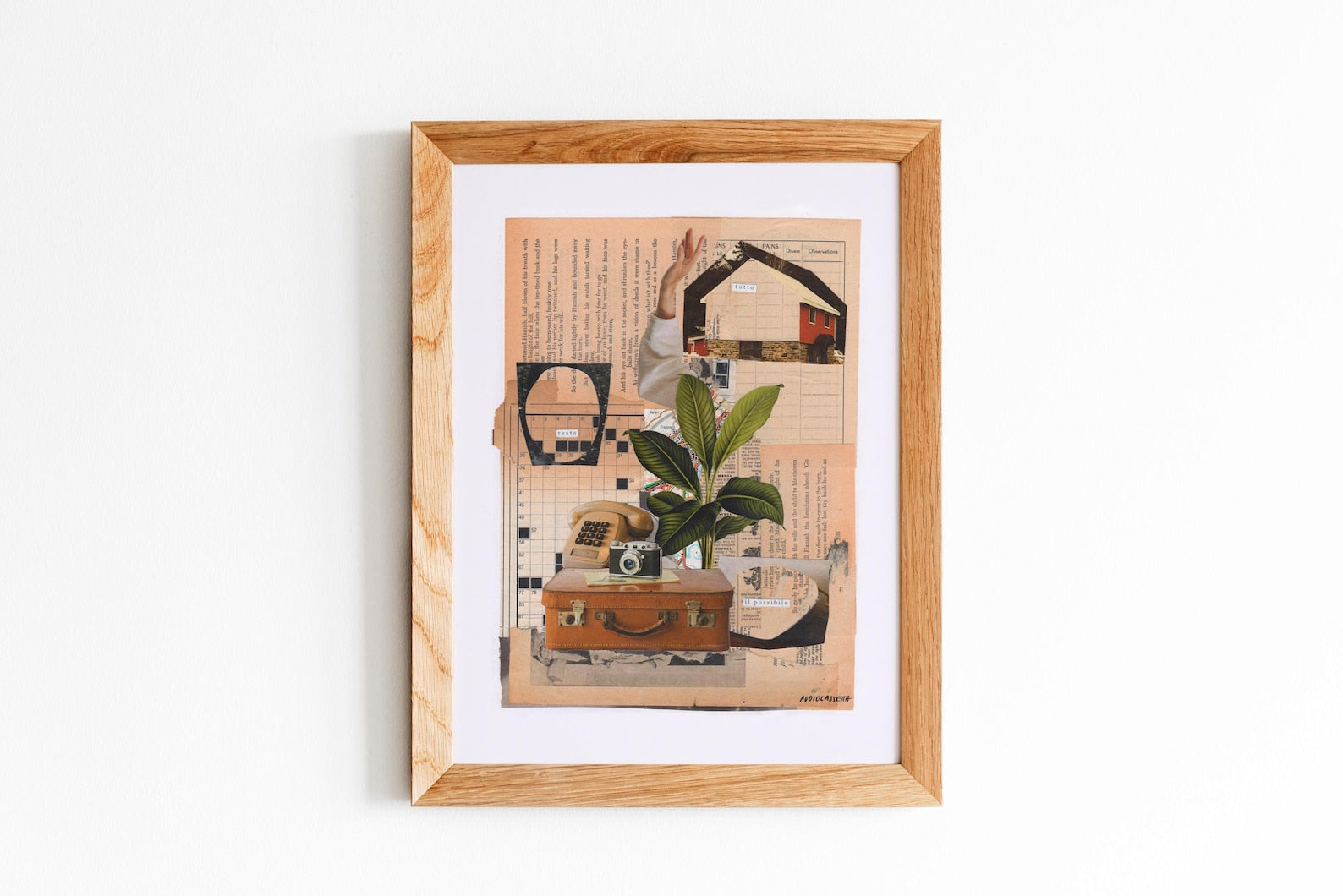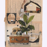 L’opera è costruita con ritagli di pagine vintage, vecchi registri, cruciverba, mappe e parole isolate, arricchita da oggetti d’epoca e da una pianta verde rigogliosa. La casa sullo sfondo, sospesa tra passato e presente, rappresenta un luogo che non è solo fisico, ma emotivo. Il gesto della mano che si alza, come a salutare o accogliere, aggiunge un tocco umano che rende l’immagine ancora più narrativa.