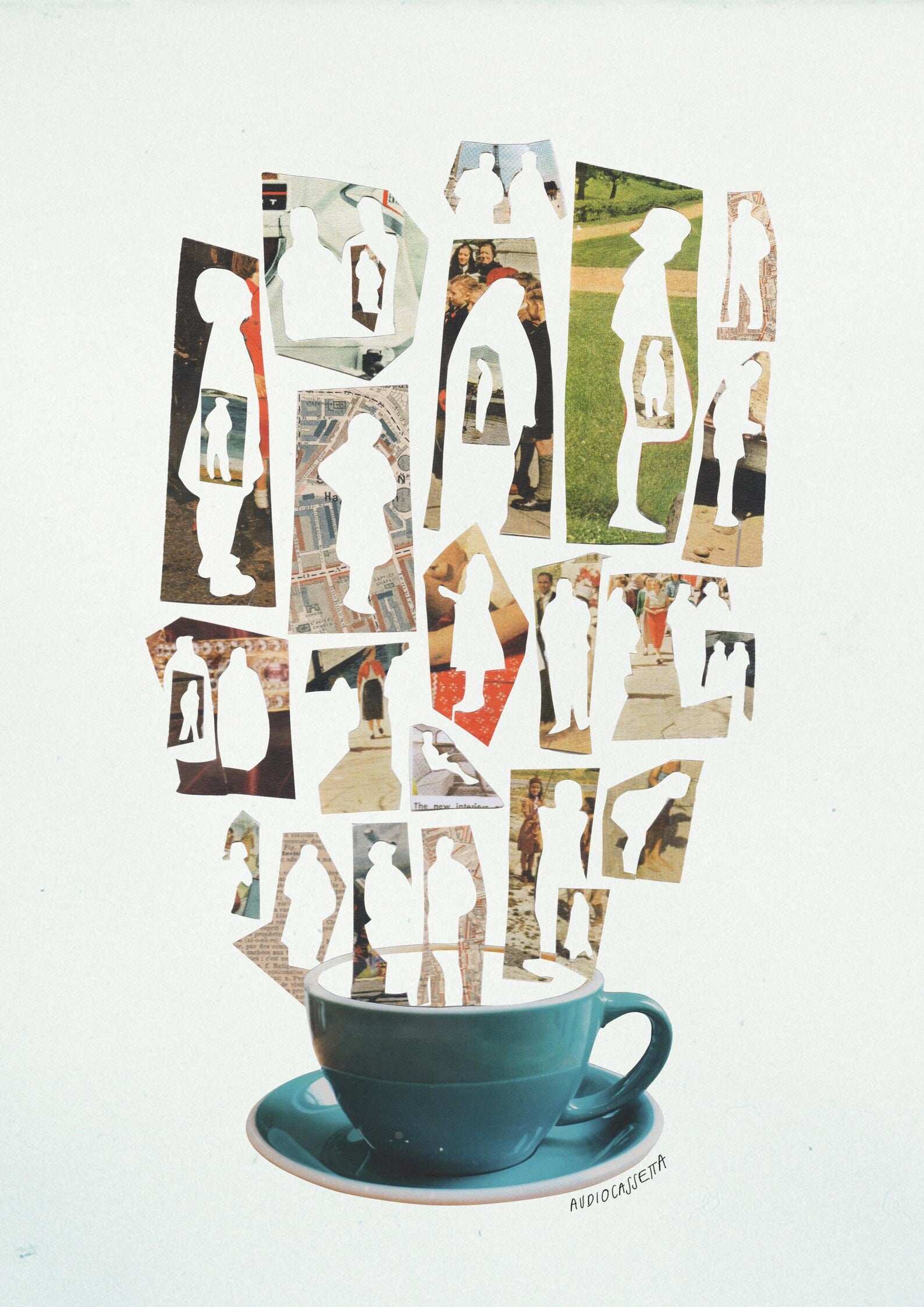 Una composizione semplice ma evocativa. Da una tazza in basso si alzano come fumo sagome vuote di persone, ritagliate da texture diverse, leggere e colorate.