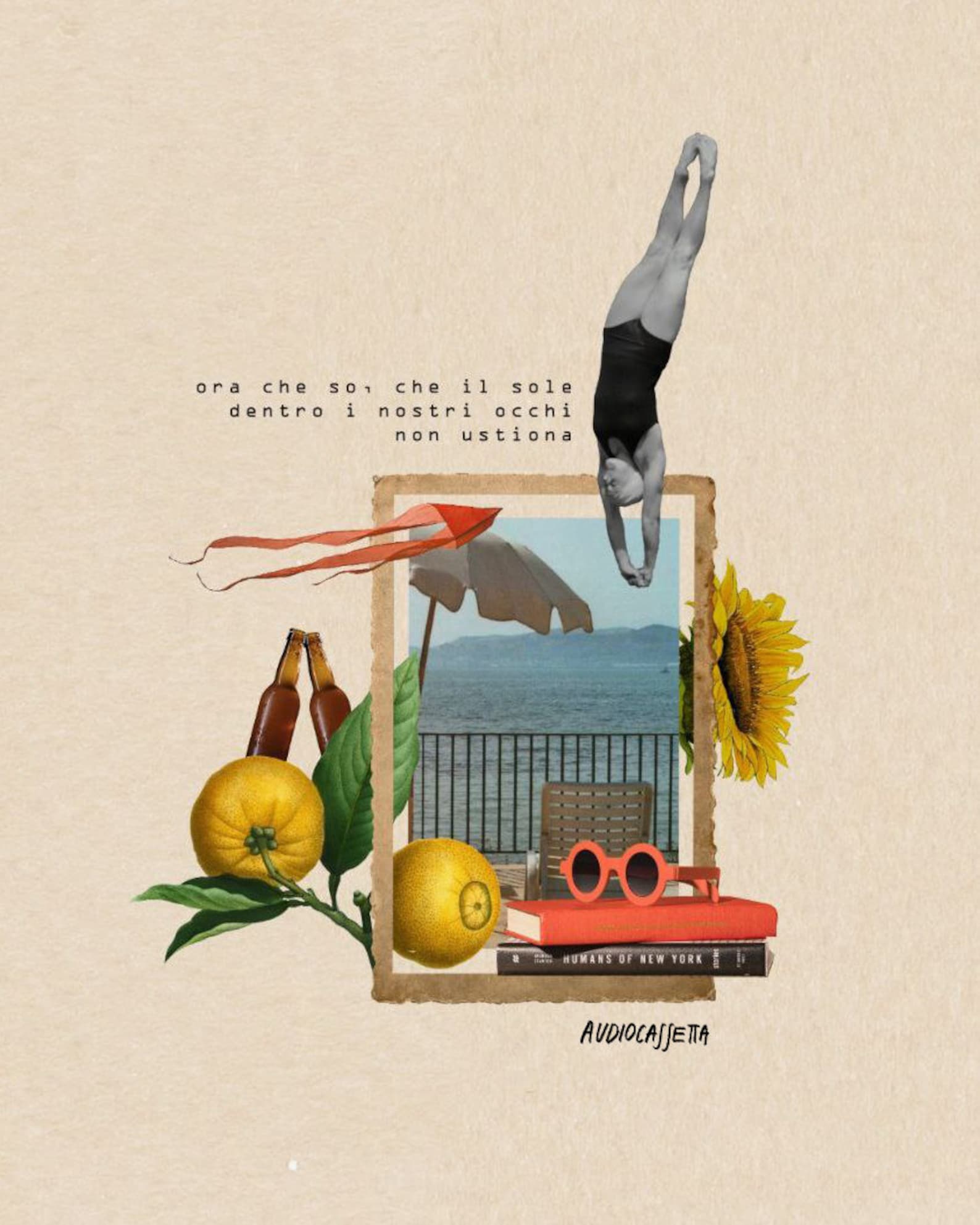 Il collage vuole catturare l’estate nella sua spensieratezza e nella sua frizzante anarchia: birrette tra le mani, occhiali da sole, granite al limone, dettagli che raccontano i giorni caldi trascorsi senza orologio.