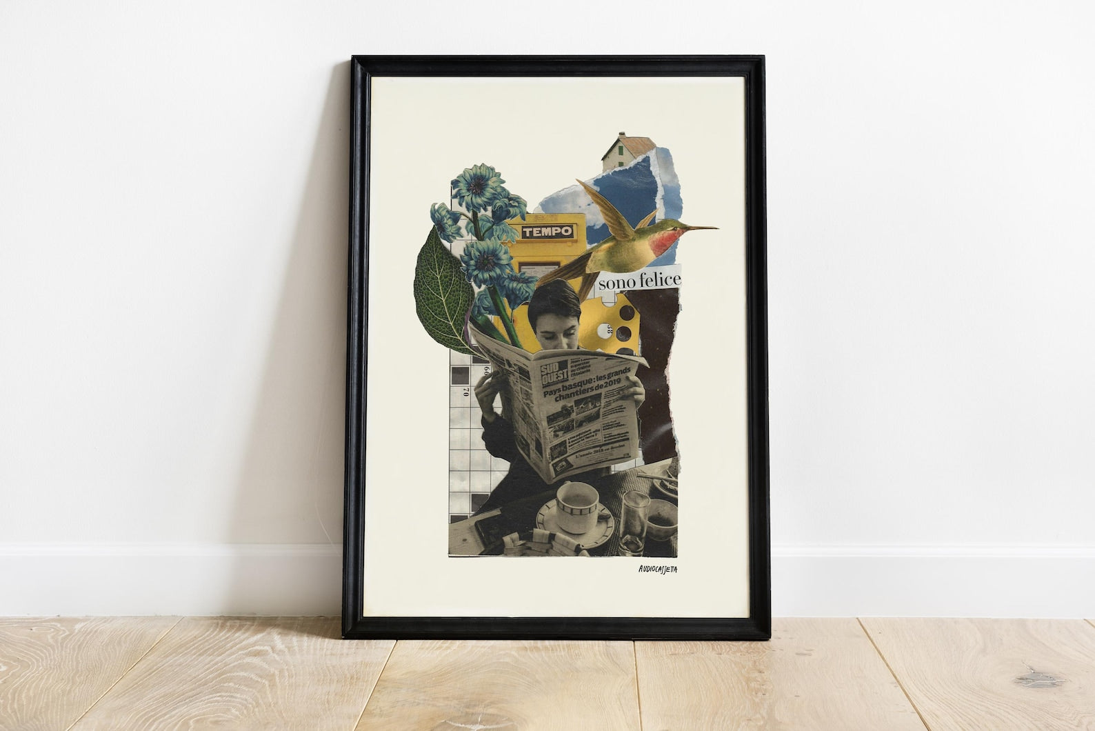 La felicità qui non è dichiarata, ma suggerita. Sta nel gesto semplice di leggere un giornale, nel tempo che rallenta davanti a una tazza di caffè, nelle cose che convivono senza fretta. Ogni elemento trova il proprio equilibrio, come in una pausa sospesa.